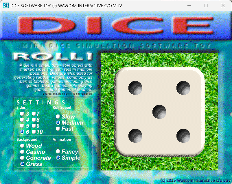 Enjoy DICE by Wavcom Software! A Dice simulator with up to 10 SIDES. Includes options -
